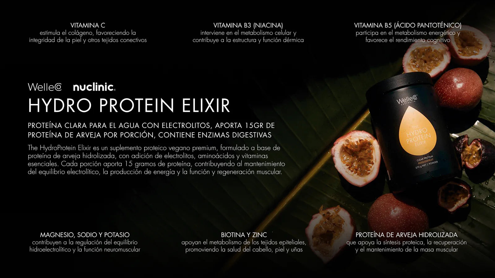 Un polvo proteico premium y vegano, The HydroProtein Elixir está formulado con una combinación de proteína de arveja hidrolizada, electrolitos, aminoácidos y vitaminas. Con 15 gramos de proteína por porción, apoya el equilibrio de electrolitos para un cuerpo saludable y activo, la producción de energía y la función y reparación muscular.