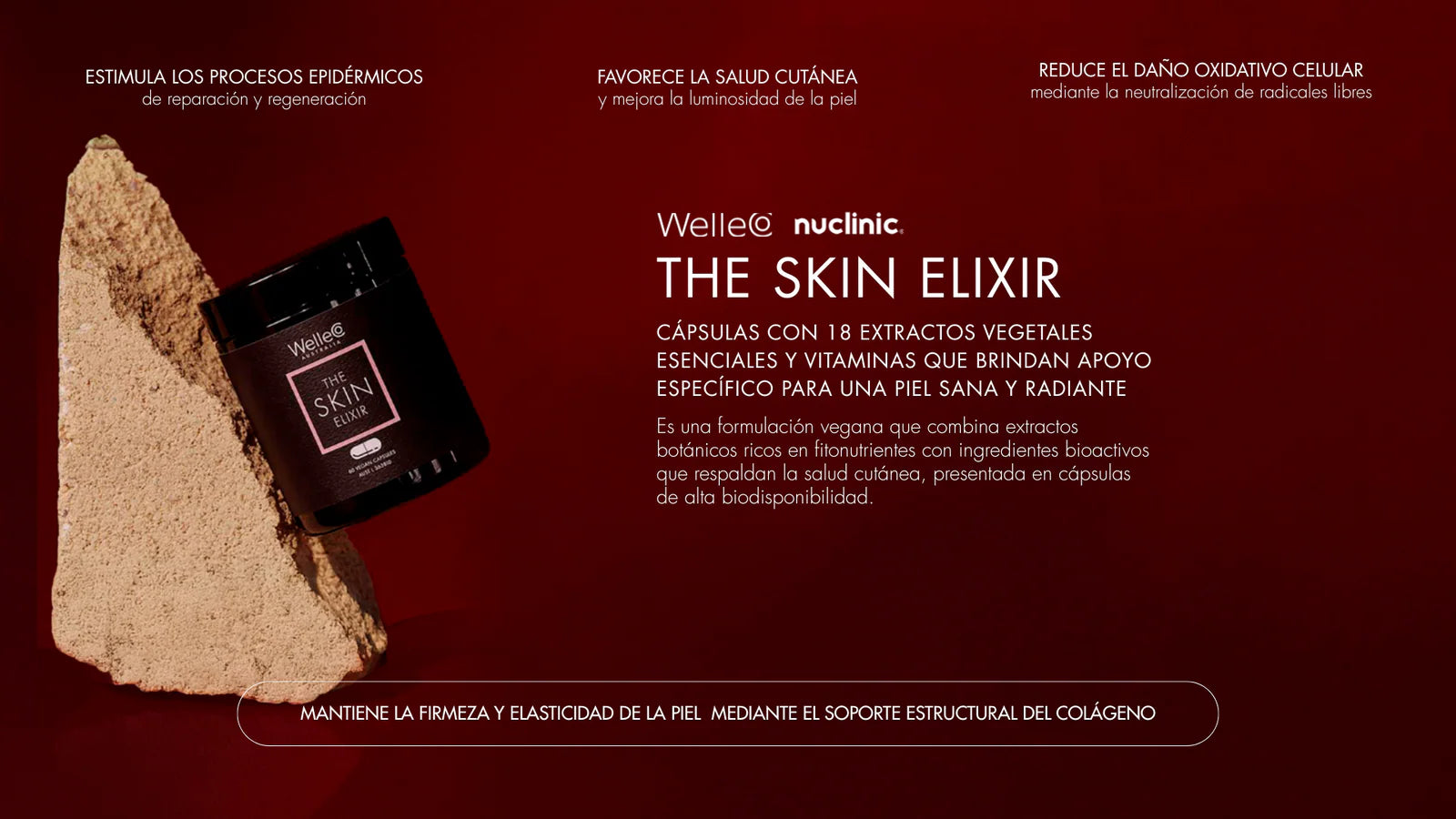 The Skin Elixir es una potente mezcla vegana de ingredientes naturales verdes y que apoyan la piel, en una cápsula conveniente y de alta biodisponibilidad para un brillo saludable desde el alma hasta la piel. Inspirado en nuestro icónico polvo premium de verduras The Super Elixir™, The Skin Elixir está diseñado específicamente para favorecer un cutis claro y radiante en cápsulas veganas supercargadas y prácticas, libres de organismos modificados genéticamente (no-OGM), gluten y lácteos.