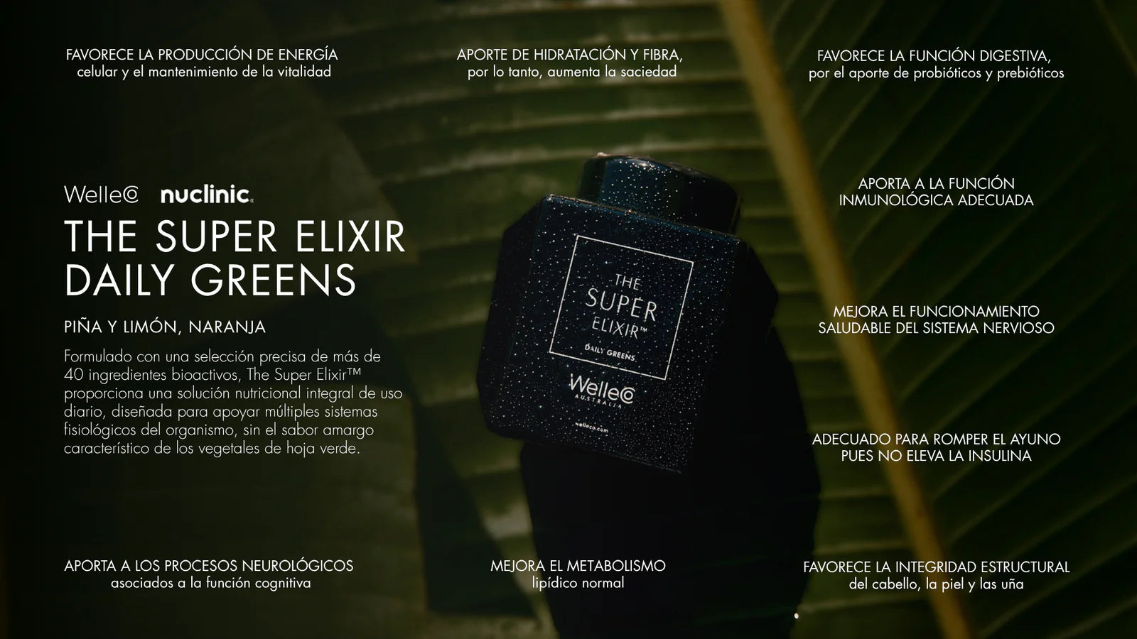 Cuidadosamente formulado con más de 40 ingredientes, The Super Elixir™ ofrece una solución diaria integral para todo tu cuerpo, sin el sabor amargo de los clásicos polvos verdes.